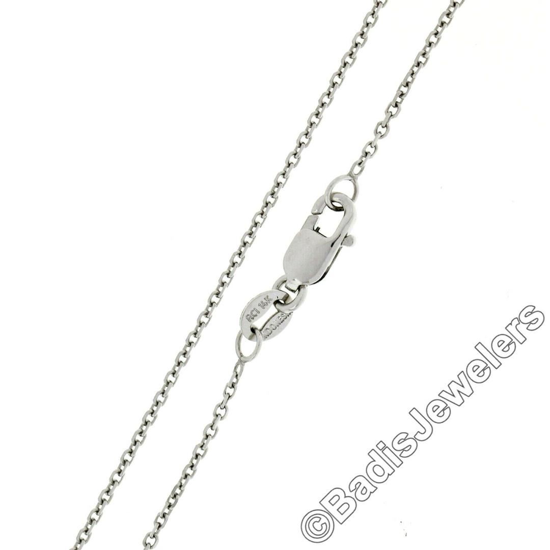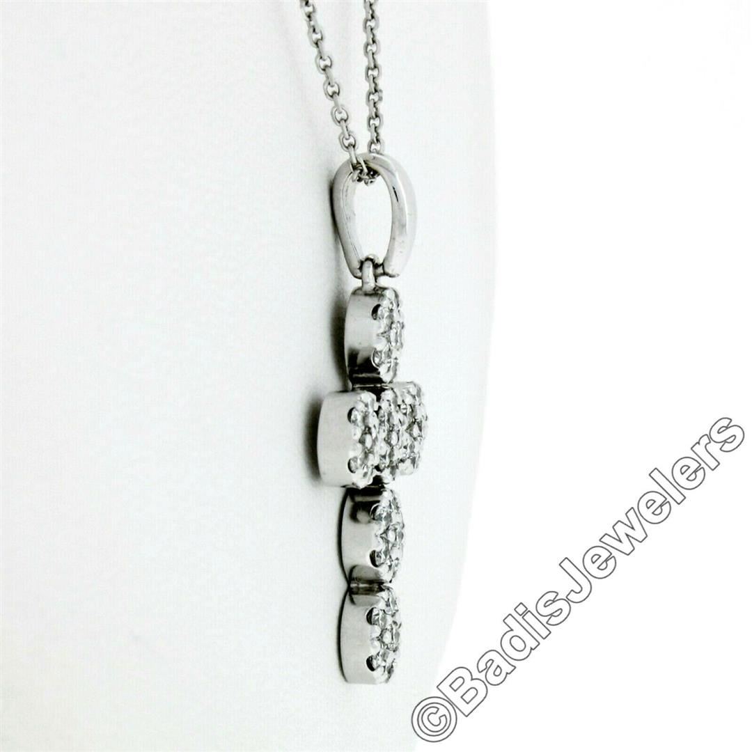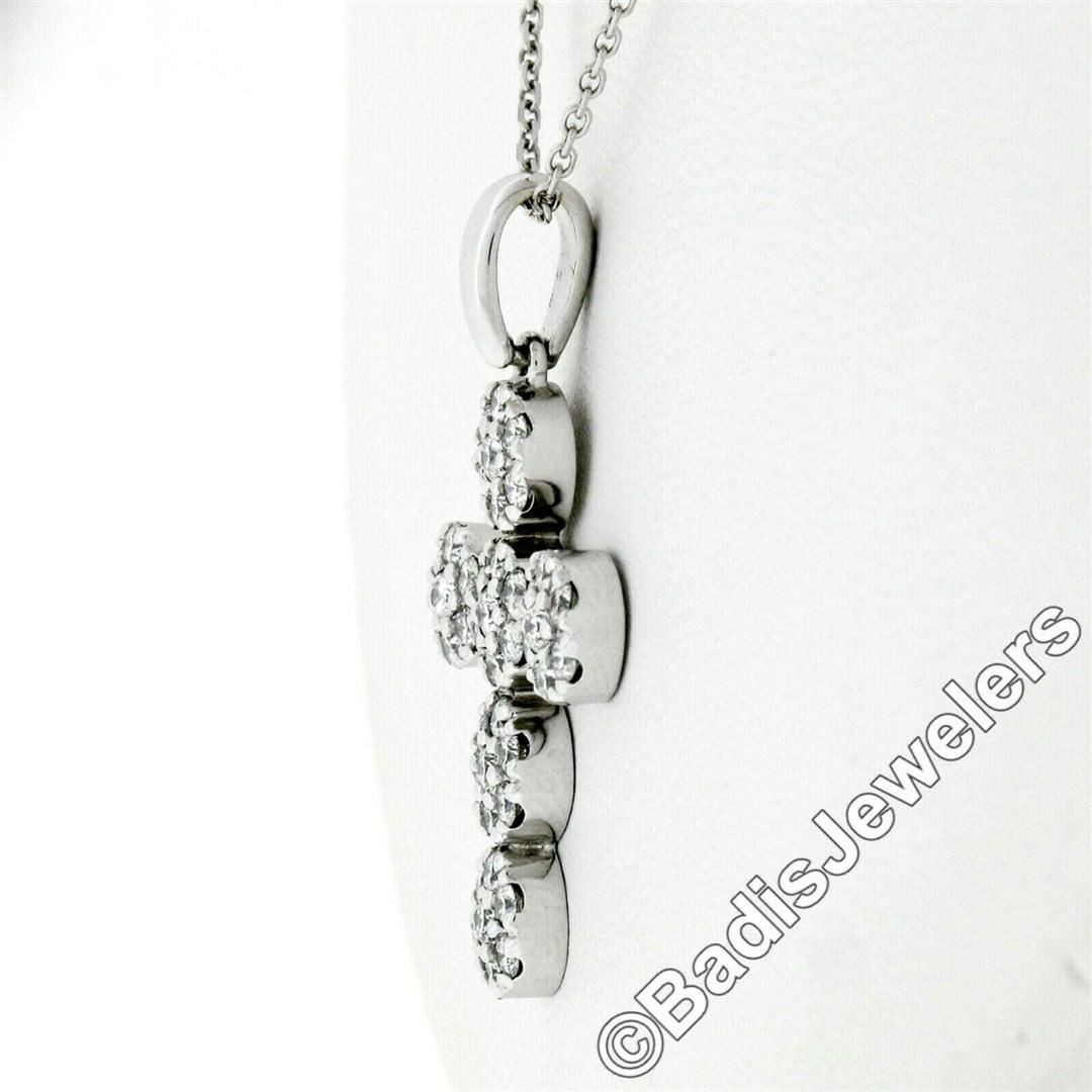 A new 14kt white gold cross pendant necklace featuring 42 round brilliant diamonds (E/F - VVS1/VVS2 ;0.85ctw) set in 6 round clusters. 18 inch cable link chain, 4.48 grams total weight, pendant measures 30.7x17.0mm.