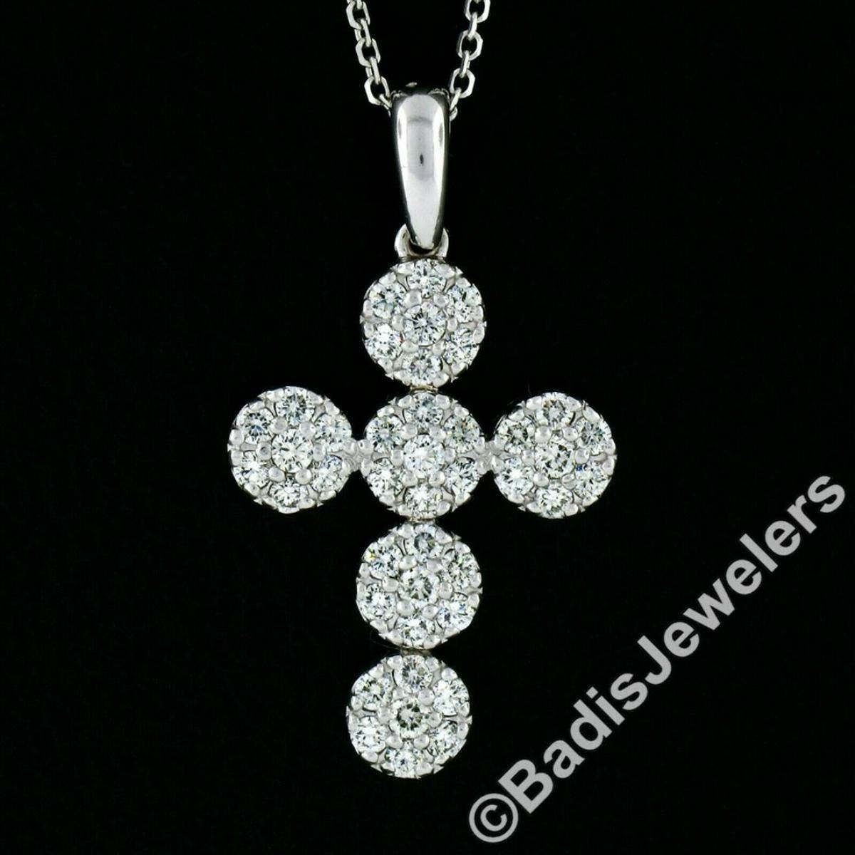 A new 14kt white gold cross pendant necklace featuring 42 round brilliant diamonds (E/F - VVS1/VVS2 ;0.85ctw) set in 6 round clusters. 18 inch cable link chain, 4.48 grams total weight, pendant measures 30.7x17.0mm.