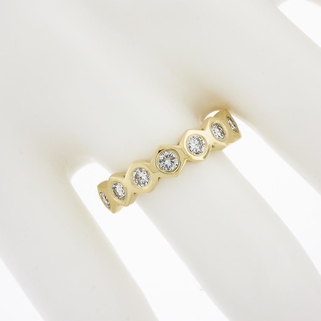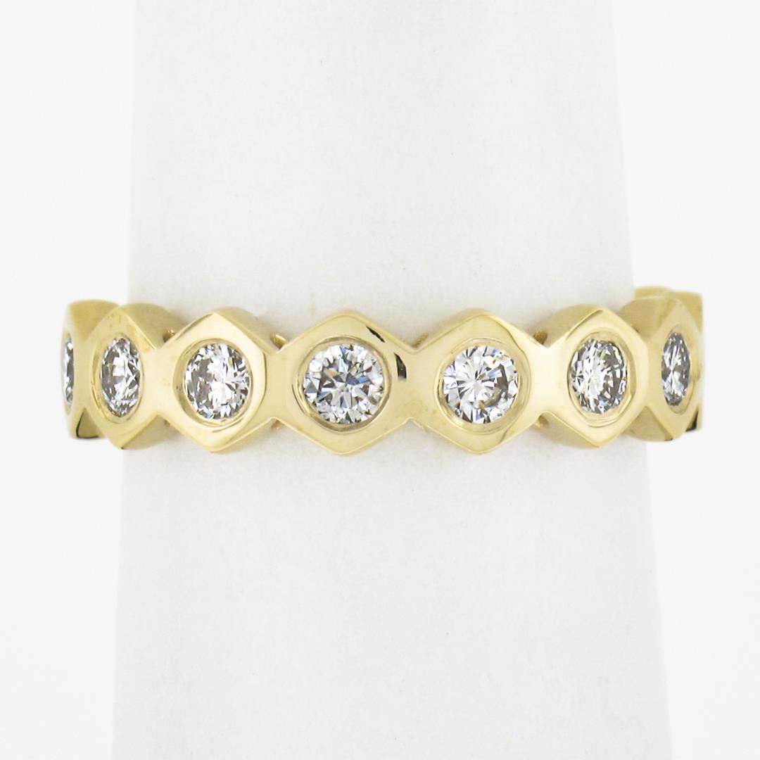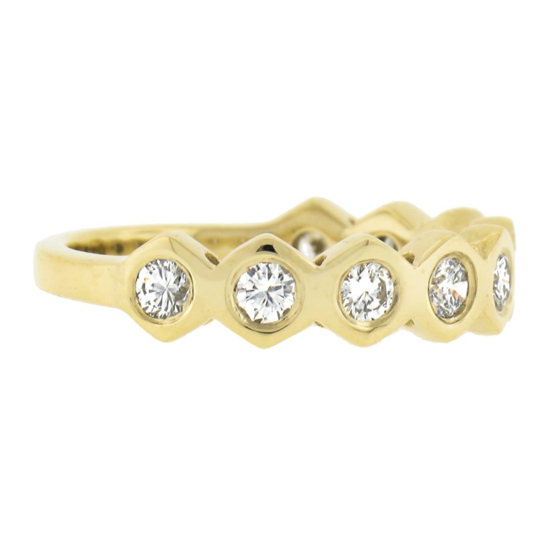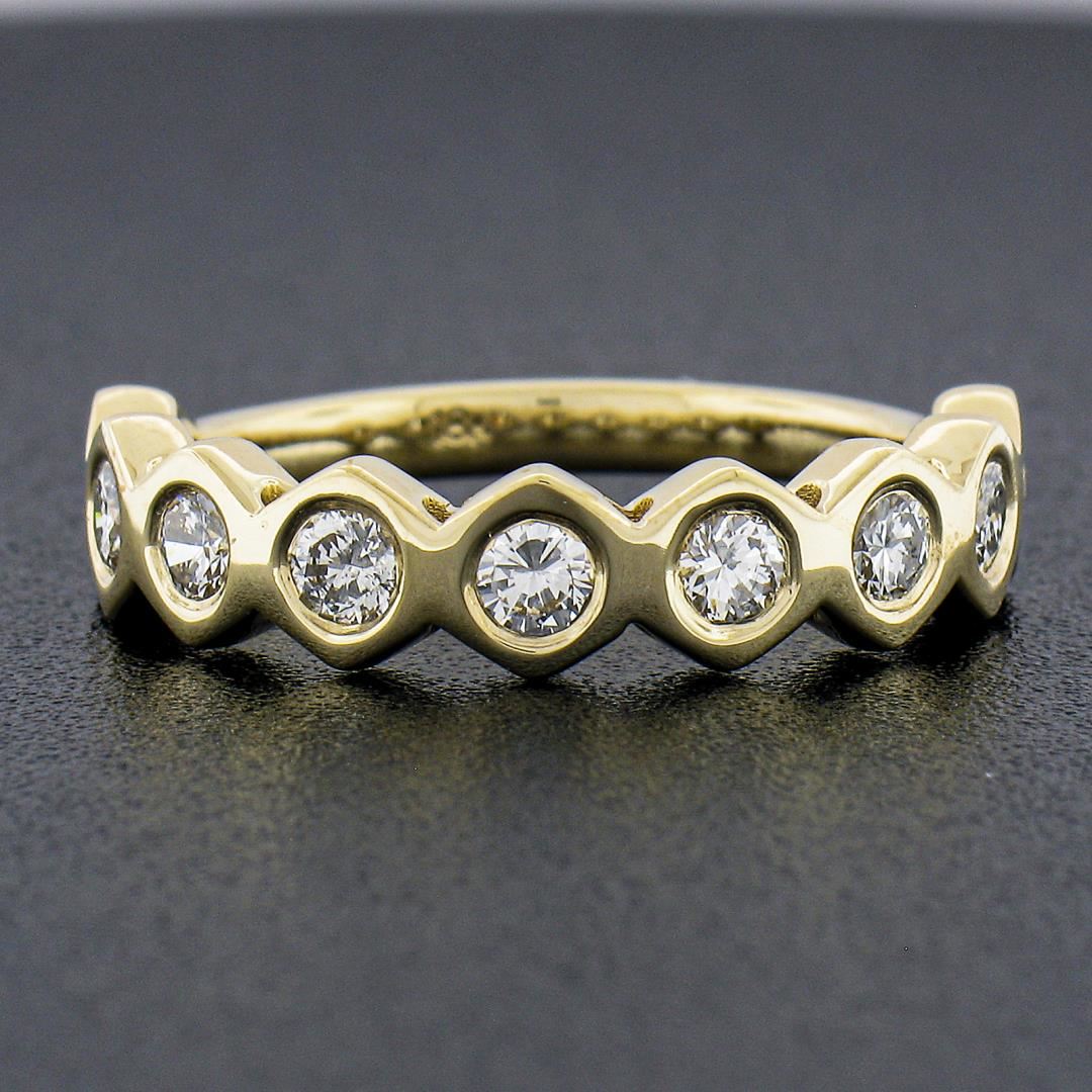 A new solid 18k yellow gold band ring, with 9 round cut natural diamonds (G/H - VS1-SI2 ; 0.58ctw). The ring is size 6.0, weighs a total of 4.09 grams, and measures 4.7mm wide.