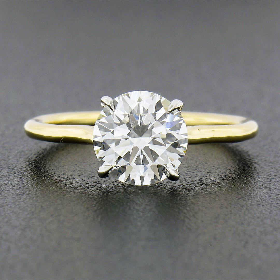 A new solid 18k yellow gold & platinum solitaire engagement rinn, with 1 GIA graded ideal round cut natural diamond (G - VS1 ; 1.51ct). The ring is size 5.25, weighs a total of 2.48 grams, and measures 7.4mm wide. Comes with all original relevant certifications.