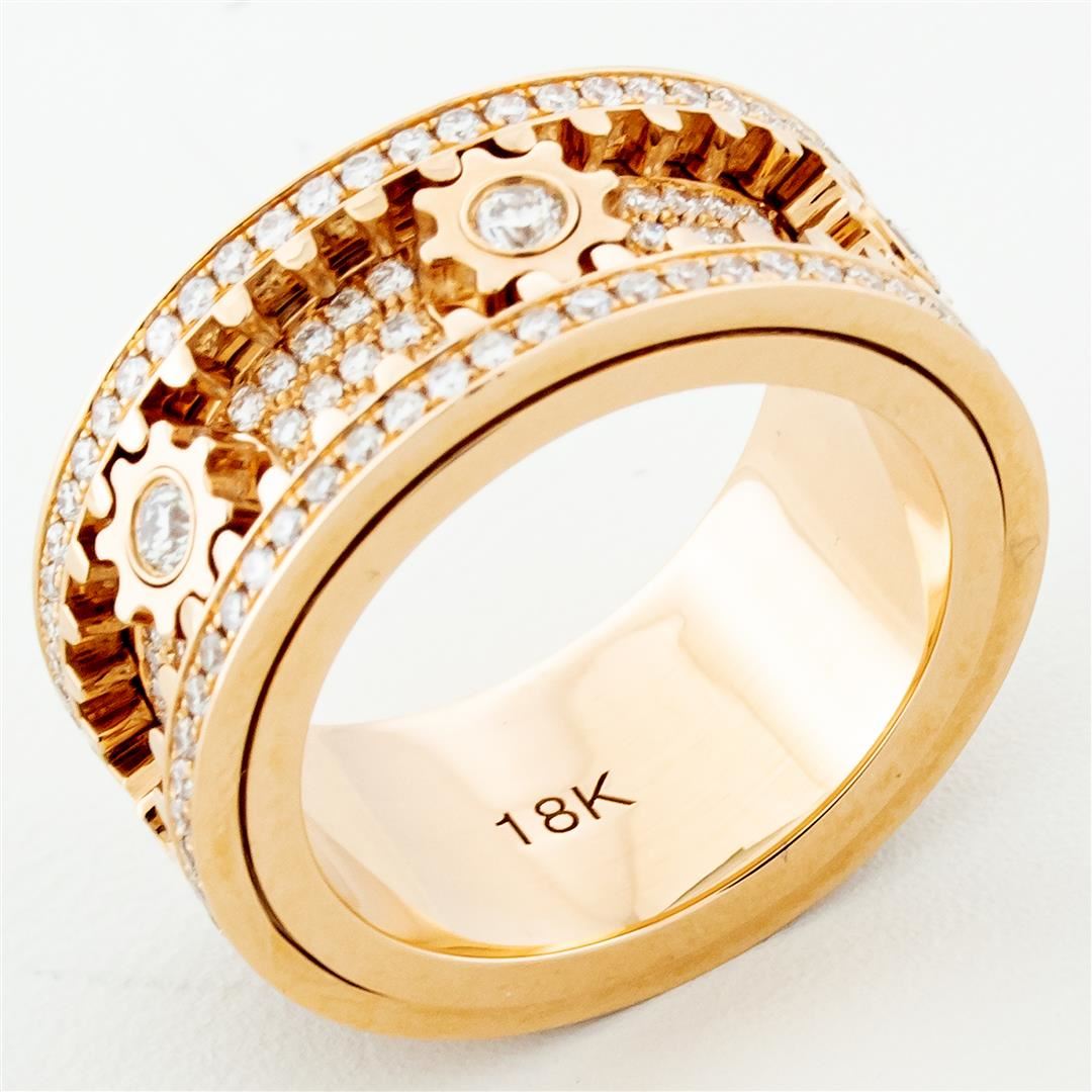 One New 18KT Rose Gold Ladies Diamond Spinning Gear Ring, Ring Size 6.5, Ring Width: 9.50MM, Stone Count: 230 Diamonds On Ring, Stone Size: 6 X 3MM Stones On Gears Of The Ring, 140 X 1.3 MM Stones On The Outside Band Of The Ring, 84 X 1.33 MM On The Center Of The Ring. Diamond Color: G, Clarity: VVS, Total Ring Weight 16.87 Grams, Total Carat Weight: 2.75ctw. Condition: Brand New. The Inside Gears Of The Ring Spin As You Rotate The Outer Band Of The Ring. This Ring Comes With An Appraisal. Please Make Sure Your Ring Size Is 6.5 As This Ring Is Not Sizeable.
