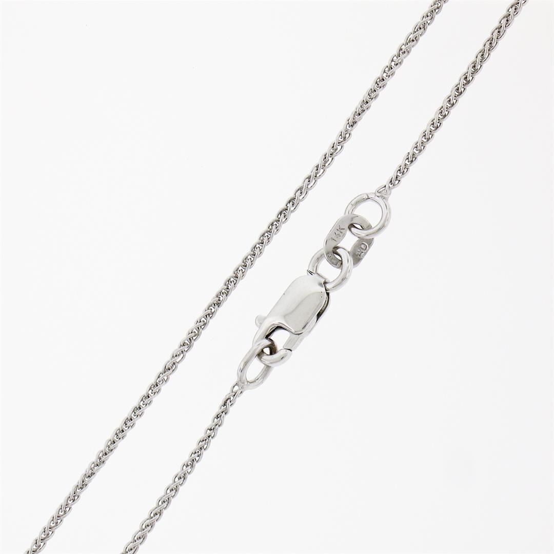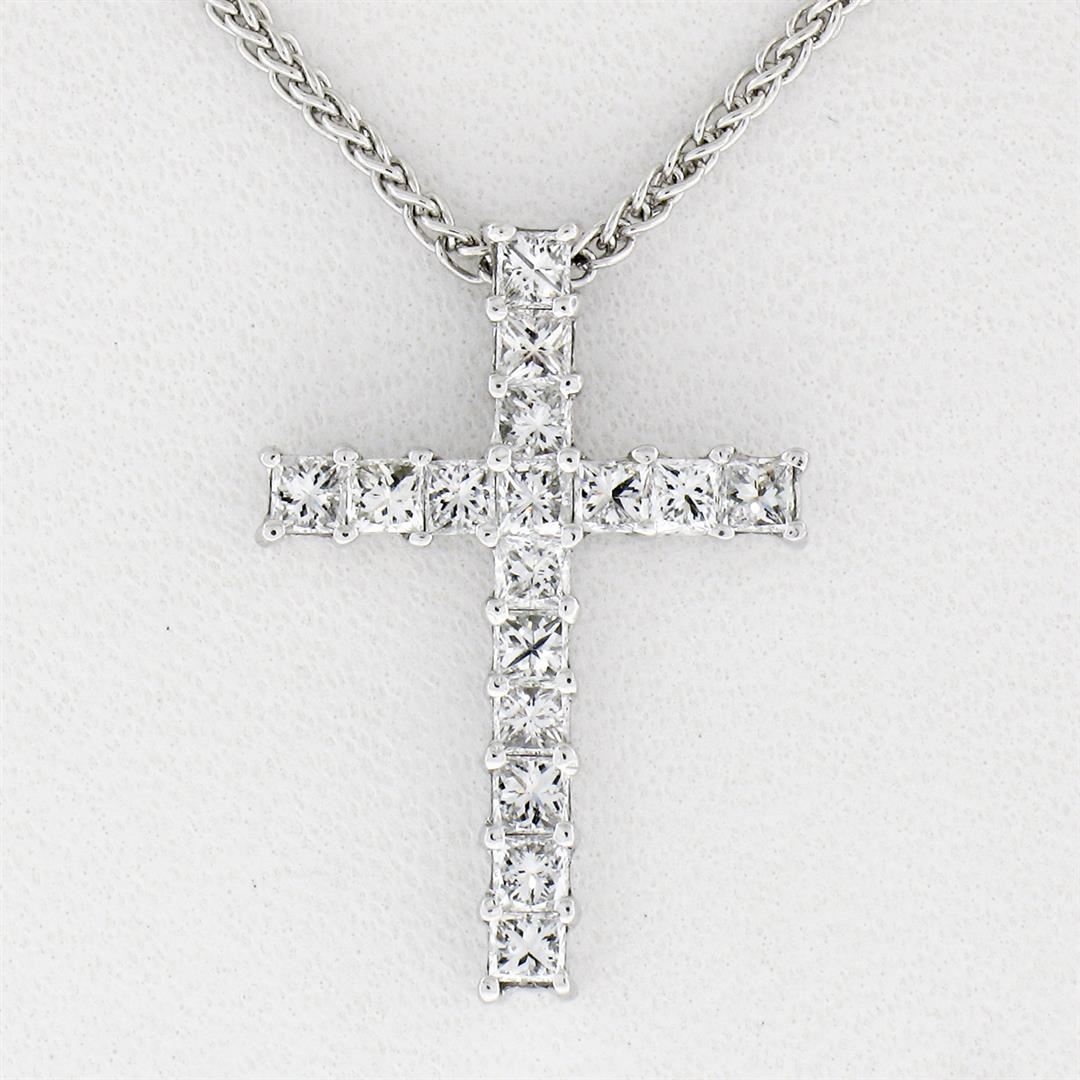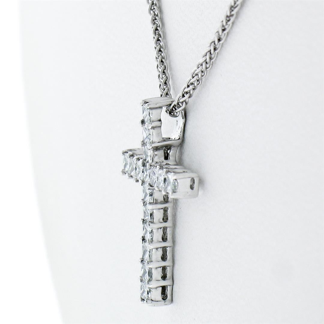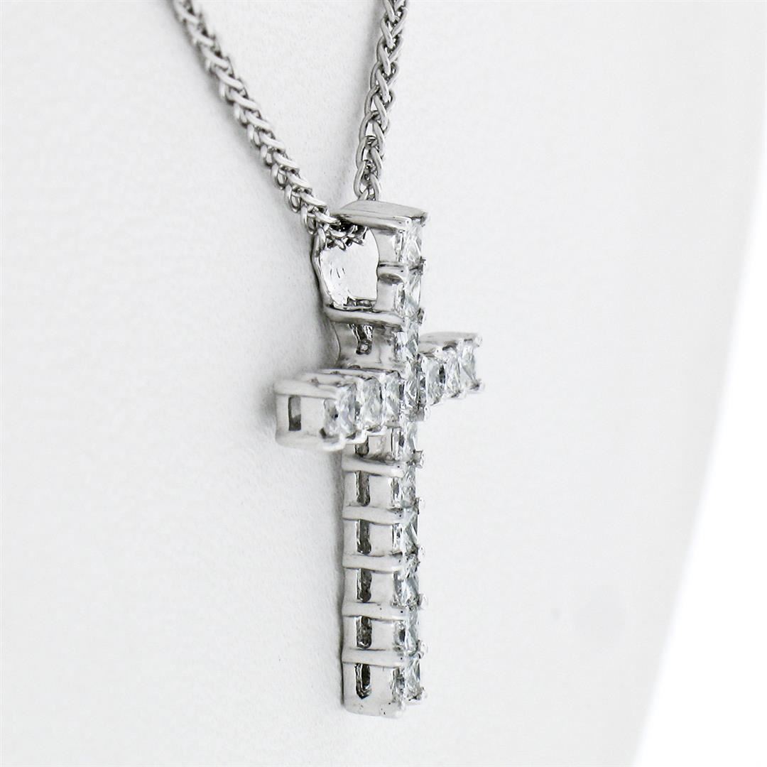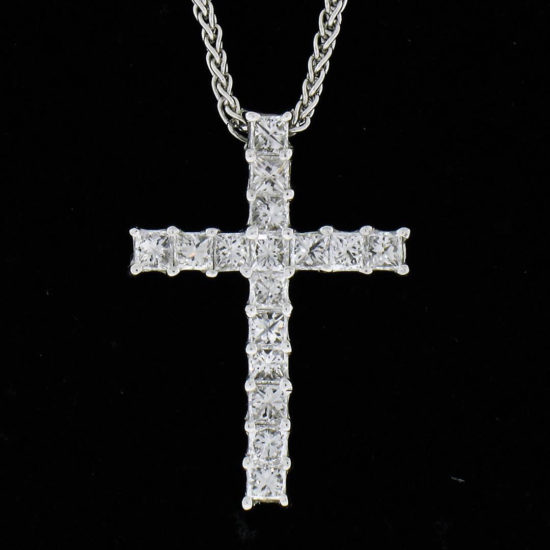 A new solid 18k white gold cross pendant, with 16 princess cut natural diamonds (F/G - VS1/VS2; 0.47ctw). The pendant weighs a total of 2.71 grams, measures 17.40x12.25mm including the bail, and 14k white gold16 inch fine wheat link chain.