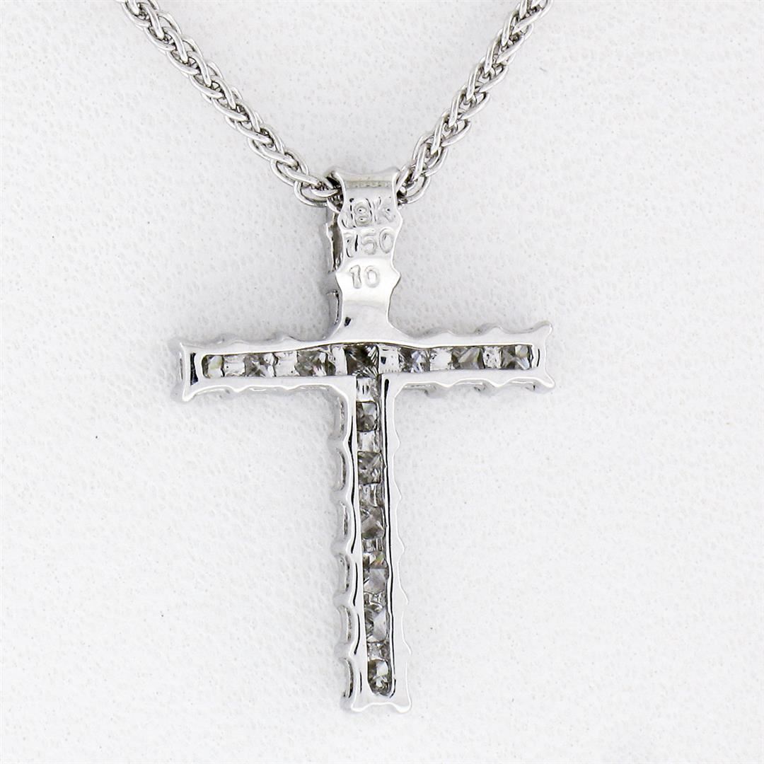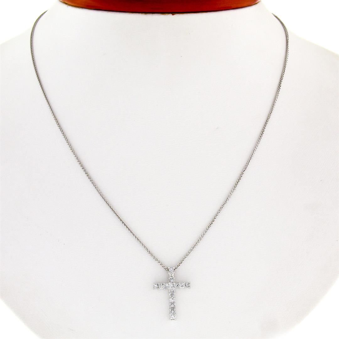 A new solid 18k white gold cross pendant, with 16 princess cut natural diamonds (F/G - VS1/VS2; 0.47ctw). The pendant weighs a total of 2.71 grams, measures 17.40x12.25mm including the bail, and 14k white gold16 inch fine wheat link chain.