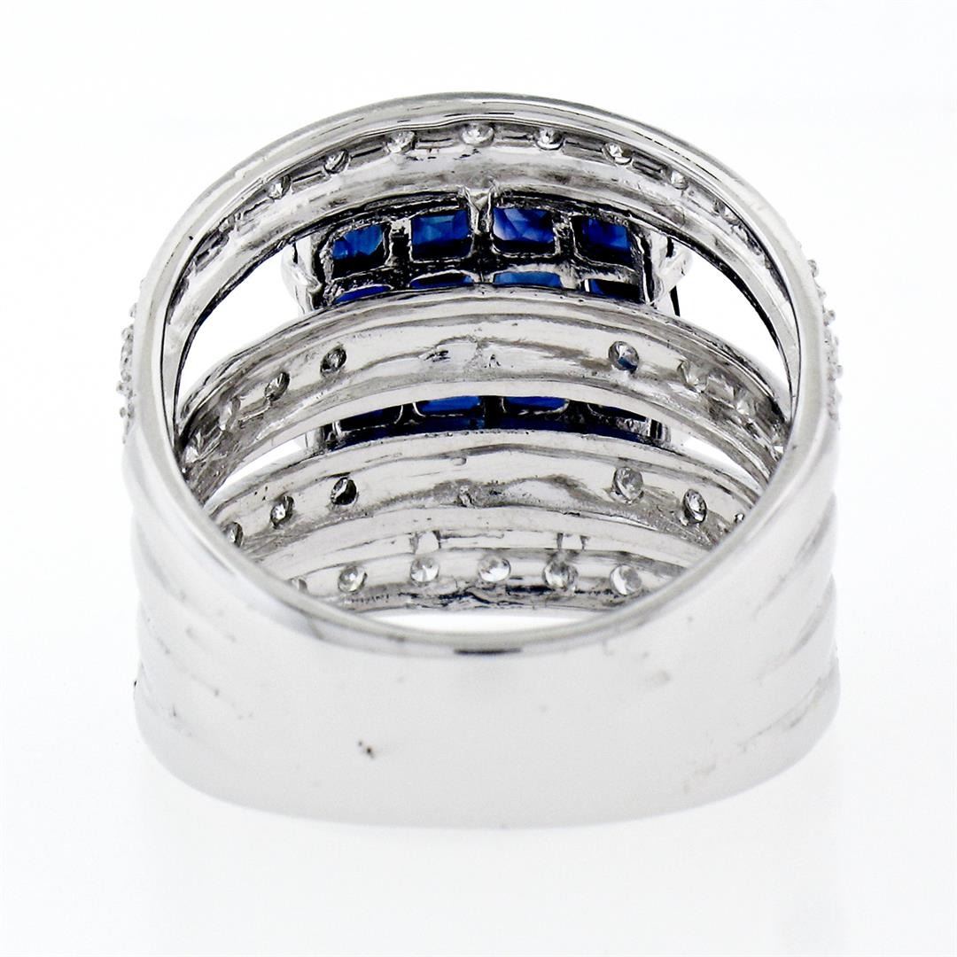 A new solid 18k whte gold square ring, with 16 round brilliant cut natural sapphires (2.50ctw), and 54 round brilliant cut natural diamonds ( F/G- VS1/VS2; 0.65ctw). The ring is size 6.5, weighs a total of 9.07 grams, and measures 17.0mm wide.