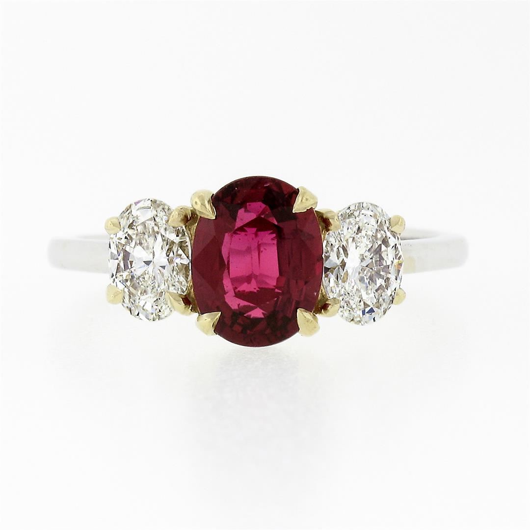 A new solid 18k white & yellow gold three stones engagement ring, with 1 Gia certified oval brilliant cut natural ruby (1.33ct ), and 2 oval brilliant cut natural diamonds (H/I - VS1 ; 0.88ctw). The ring is size 6.5, weighs a total of 2.96 grams, and measures 7.7mm wide. Comes with all original relevant certifications.