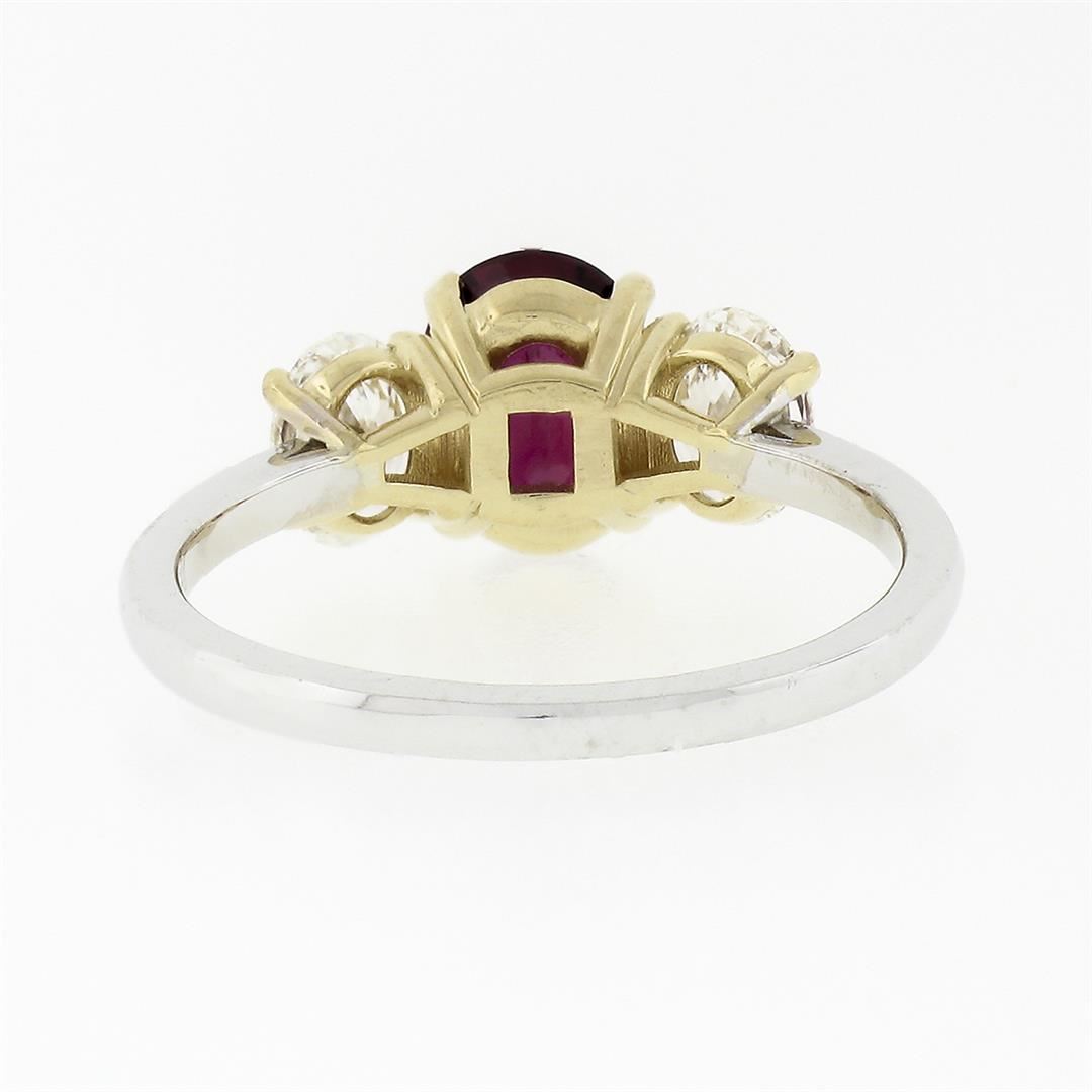 A new solid 18k white & yellow gold three stones engagement ring, with 1 Gia certified oval brilliant cut natural ruby (1.33ct ), and 2 oval brilliant cut natural diamonds (H/I - VS1 ; 0.88ctw). The ring is size 6.5, weighs a total of 2.96 grams, and measures 7.7mm wide. Comes with all original relevant certifications.