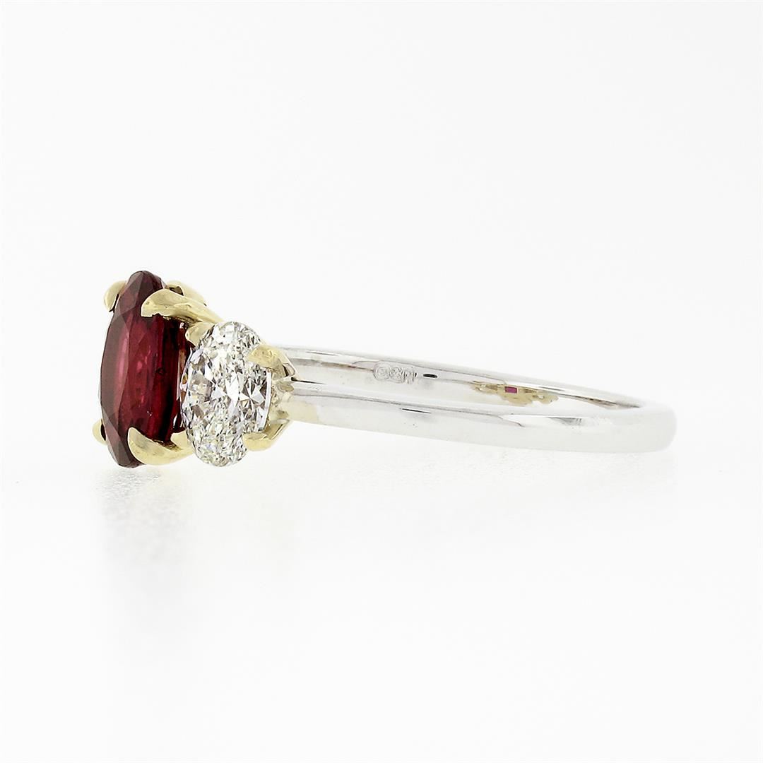 A new solid 18k white & yellow gold three stones engagement ring, with 1 Gia certified oval brilliant cut natural ruby (1.33ct ), and 2 oval brilliant cut natural diamonds (H/I - VS1 ; 0.88ctw). The ring is size 6.5, weighs a total of 2.96 grams, and measures 7.7mm wide. Comes with all original relevant certifications.