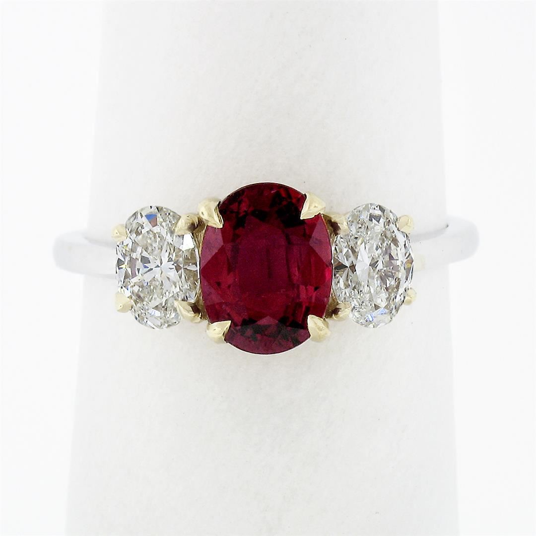 A new solid 18k white & yellow gold three stones engagement ring, with 1 Gia certified oval brilliant cut natural ruby (1.33ct ), and 2 oval brilliant cut natural diamonds (H/I - VS1 ; 0.88ctw). The ring is size 6.5, weighs a total of 2.96 grams, and measures 7.7mm wide. Comes with all original relevant certifications.