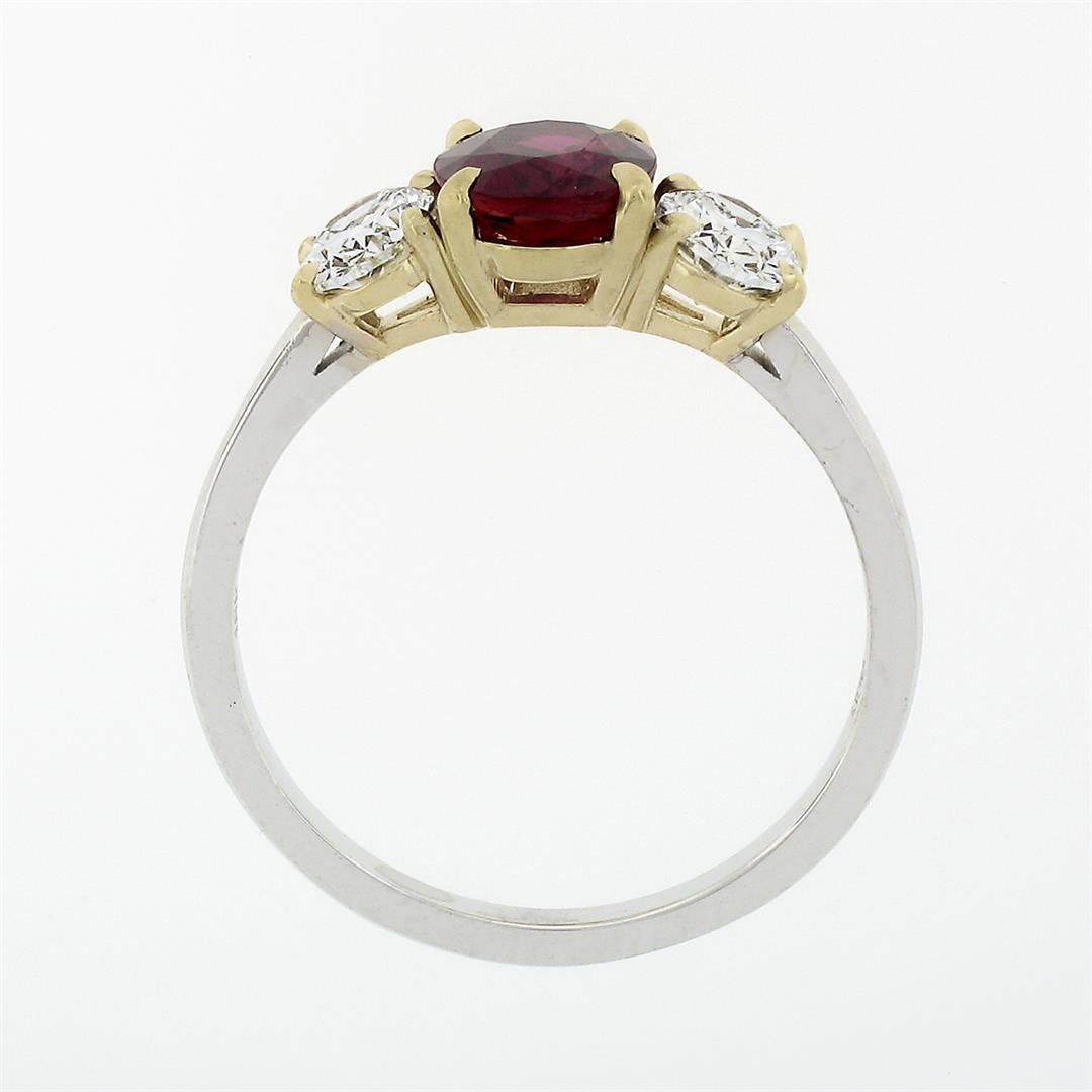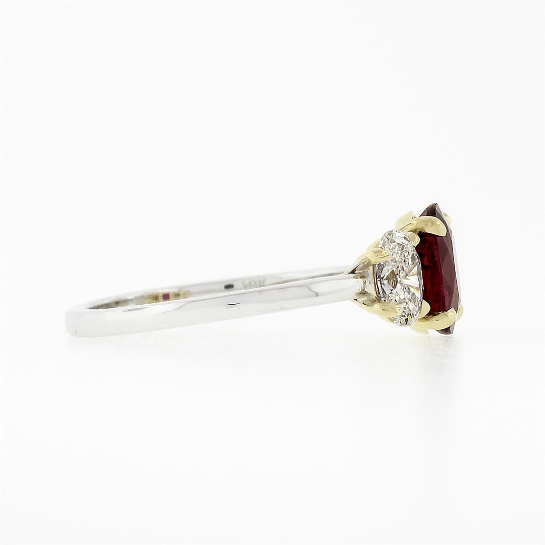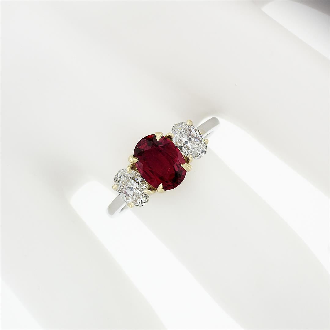 A new solid 18k white & yellow gold three stones engagement ring, with 1 Gia certified oval brilliant cut natural ruby (1.33ct ), and 2 oval brilliant cut natural diamonds (H/I - VS1 ; 0.88ctw). The ring is size 6.5, weighs a total of 2.96 grams, and measures 7.7mm wide. Comes with all original relevant certifications.
