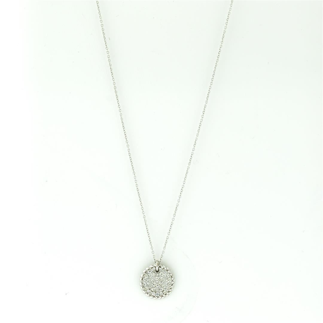 One New 18KT White Gold Ladies Diamond Cable Pendant With 18K White Gold Chain, Pendant Width: 15MM, Chain Measurements: 21" in Length. Condition: Brand New. Pendant Is Set With 77 Stones Pave Setting With Round Cut Natural Diamonds, Total Diamond Weight of .54 ct. Clarity: SI2. Color: G, Total Weight 5.26 Grams. This Chain And Pendant Set Are Brand New And Come With An Appraisal.