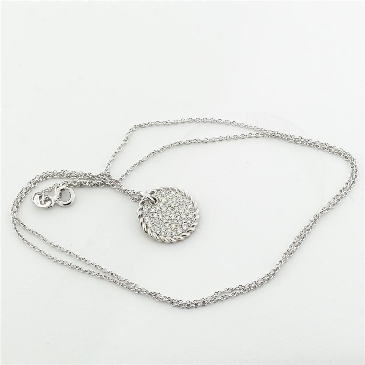One New 18KT White Gold Ladies Diamond Cable Pendant With 18K White Gold Chain, Pendant Width: 15MM, Chain Measurements: 21" in Length. Condition: Brand New. Pendant Is Set With 77 Stones Pave Setting With Round Cut Natural Diamonds, Total Diamond Weight of .54 ct. Clarity: SI2. Color: G, Total Weight 5.26 Grams. This Chain And Pendant Set Are Brand New And Come With An Appraisal.