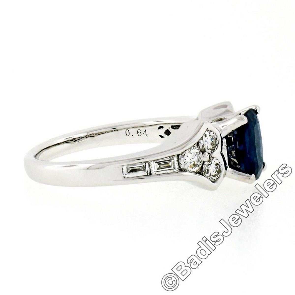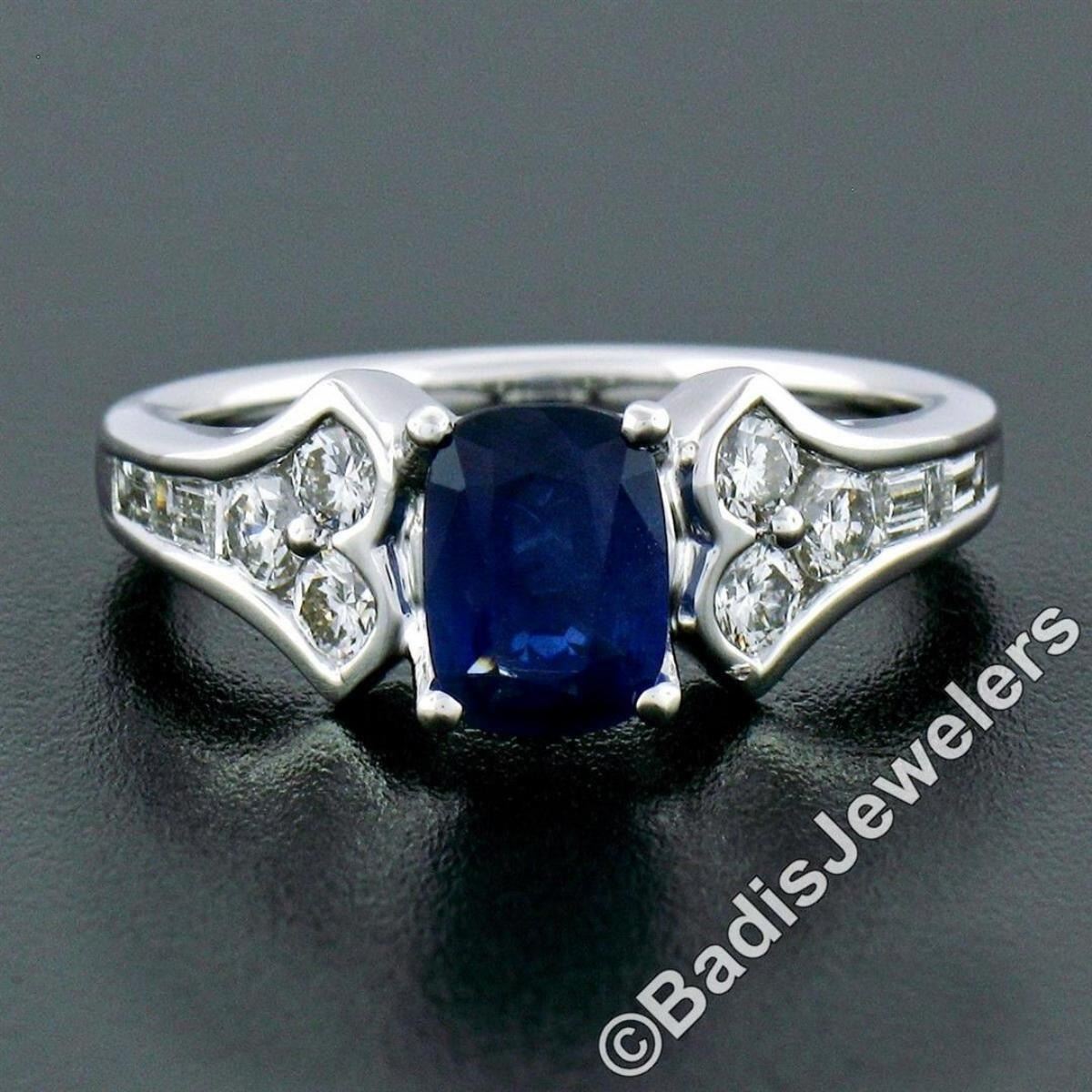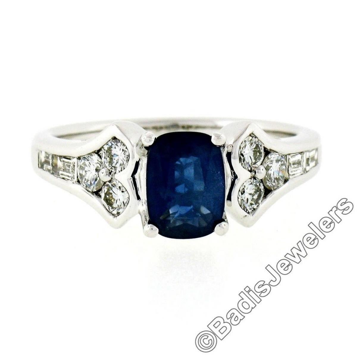 A new 18kt white gold ring featuring a 1.03ct cushion cut sapphire prong set between two tulip motifs set with 0.64ctw of round brilliant and baguette cut diamonds (E/F - VS1). The ring is size 6.5, weighs a total of 5.03 grams, and measures 7.2mm wide.