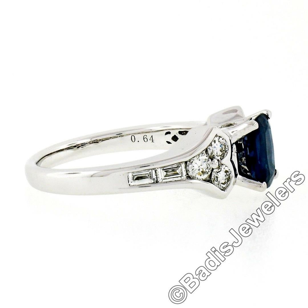 A new 18kt white gold ring featuring a 1.03ct cushion cut sapphire prong set between two tulip motifs set with 0.64ctw of round brilliant and baguette cut diamonds (E/F - VS1). The ring is size 6.5, weighs a total of 5.03 grams, and measures 7.2mm wide.