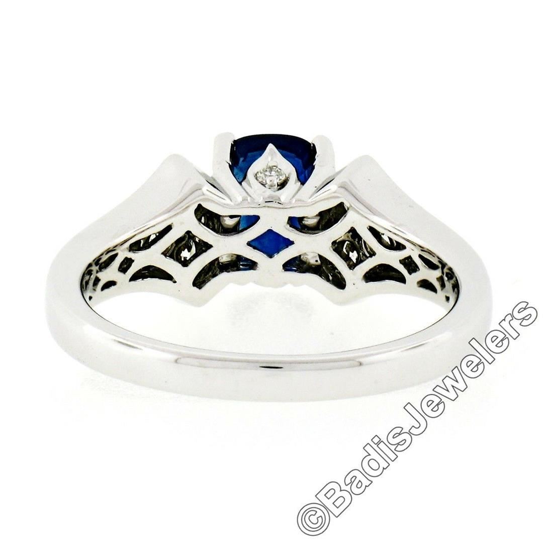 A new 18kt white gold ring featuring a 1.03ct cushion cut sapphire prong set between two tulip motifs set with 0.64ctw of round brilliant and baguette cut diamonds (E/F - VS1). The ring is size 6.5, weighs a total of 5.03 grams, and measures 7.2mm wide.