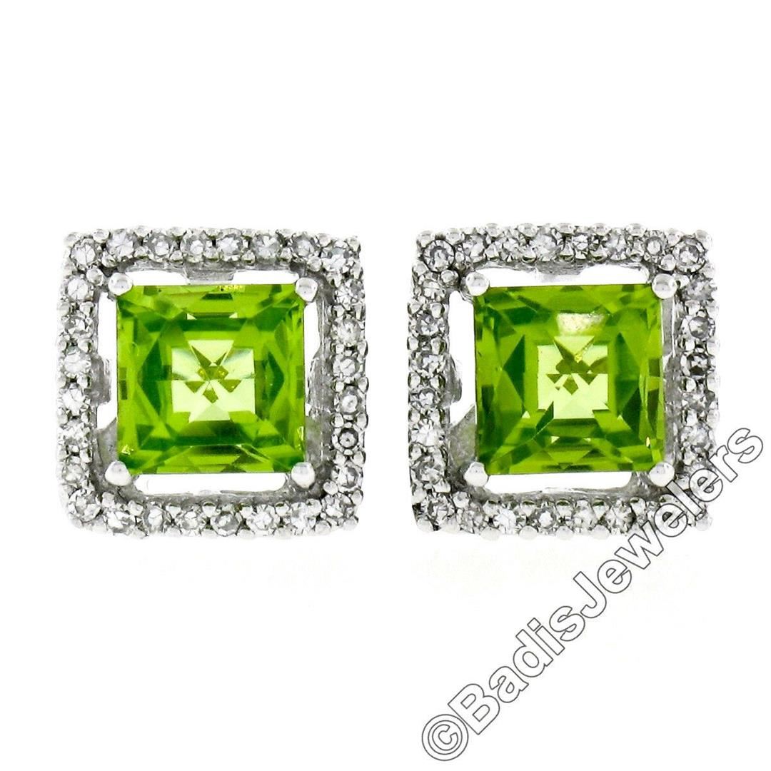 A pair of 18kt white gold stud earrings featuring a pair of square French checkerboard cut peridots (5.1x5.1mm / 1.80ctw) each surrounded by halos of 34 round single cut diamonds - 68 total (G/H - VS2/SI1; 0.40ctw). The earrings measure approximately 8.5x8.5mm and weigh a total of 3.23 grams.