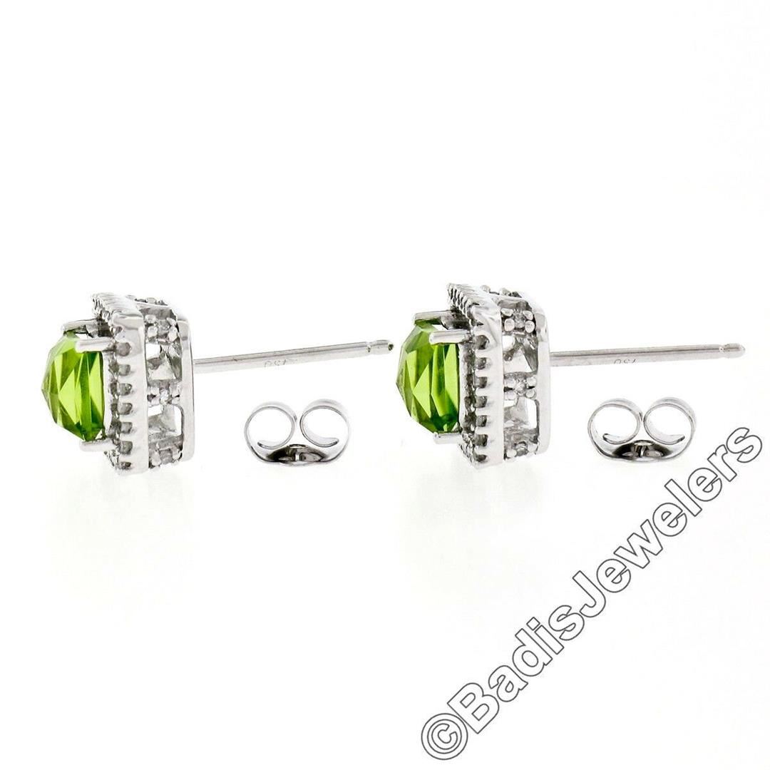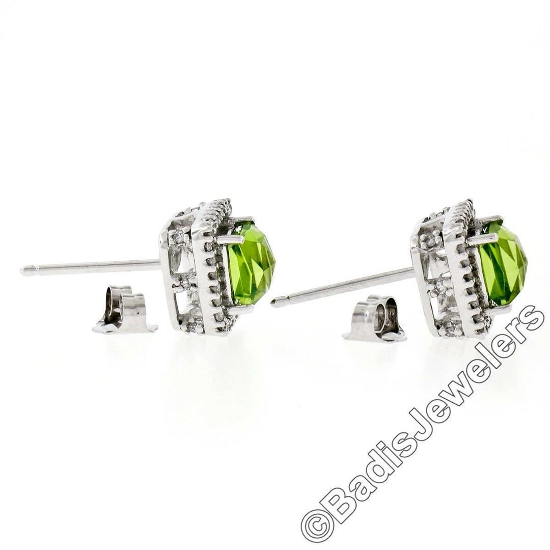 A pair of 18kt white gold stud earrings featuring a pair of square French checkerboard cut peridots (5.1x5.1mm / 1.80ctw) each surrounded by halos of 34 round single cut diamonds - 68 total (G/H - VS2/SI1; 0.40ctw). The earrings measure approximately 8.5x8.5mm and weigh a total of 3.23 grams.