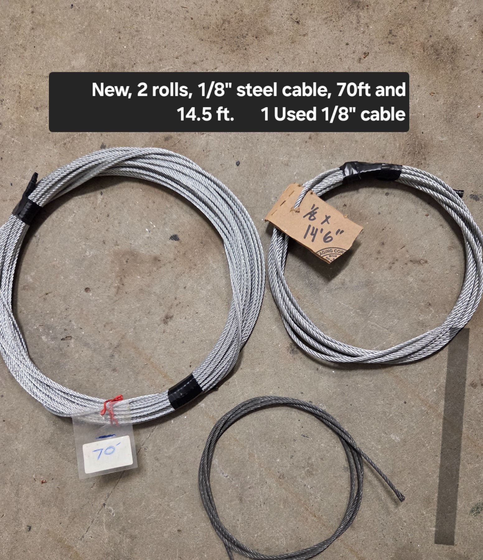New 2 Rolls 1/8" Steel Cable 70ft and 14.5ft 1 Used 1/8" Cable