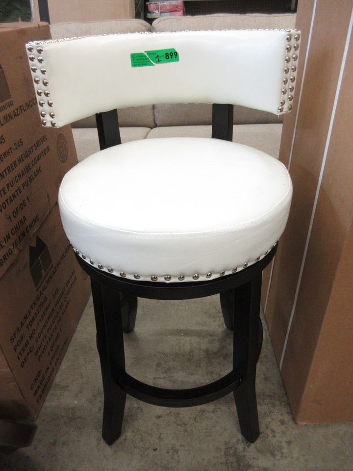 Black wood base. White pleather fabric.  Unassembled in box.