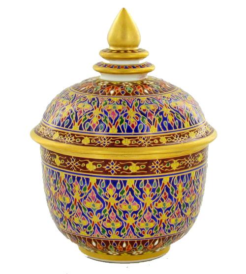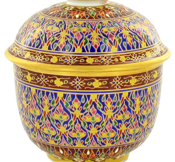 Beautiful hand-decorated, heavily guilded piece, silk presentation box, 5"