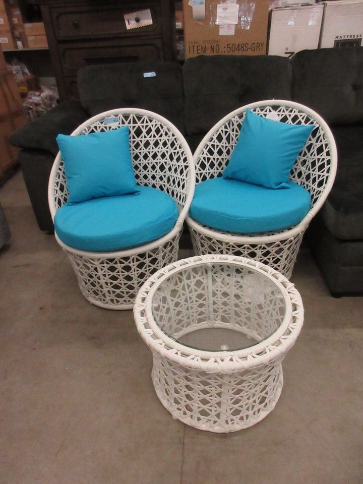 2 Resin chairs and a glass top resin table measuring 14" tall x 22" diameter. Retail tag of $399.00.