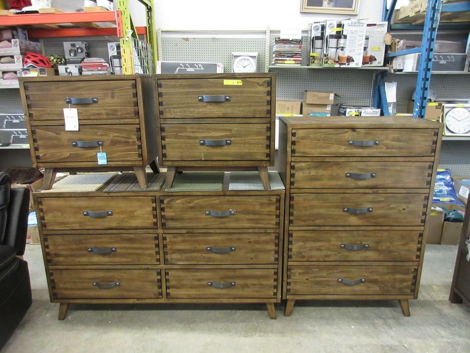 Metal handles. Lowboy dresser, 2 bedside tables & highboy dresser. Highboy is 16" x 36" x 53" tall