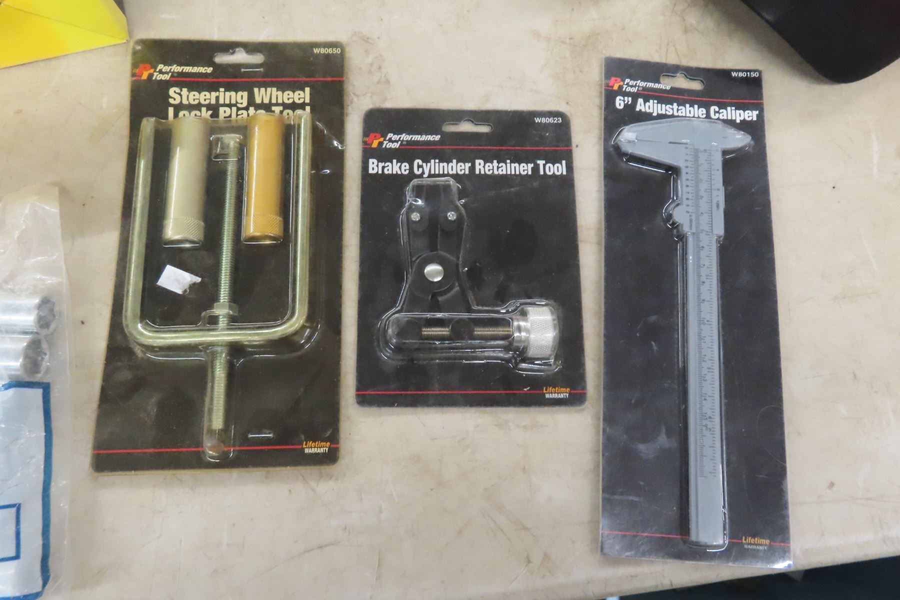 New 6'' Adjustable Caliper, Steering Wheel, Steering Wheel Lock Plate Tool, Brake Cylinder Retainer Tool, Sockets, Sand Paper