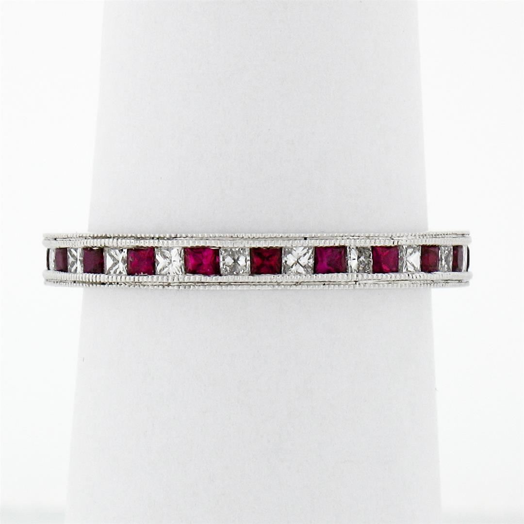 A new solid platinum eternity band ring, with 20 square calibre cut natural rubies (0.51ctw), and 20 square custom cut natural diamonds (G/H- VS1/VS2; 0.41ctw). The ring is size 6.0, weighs a total of 3.43 grams, and measures 2.70mm wide.