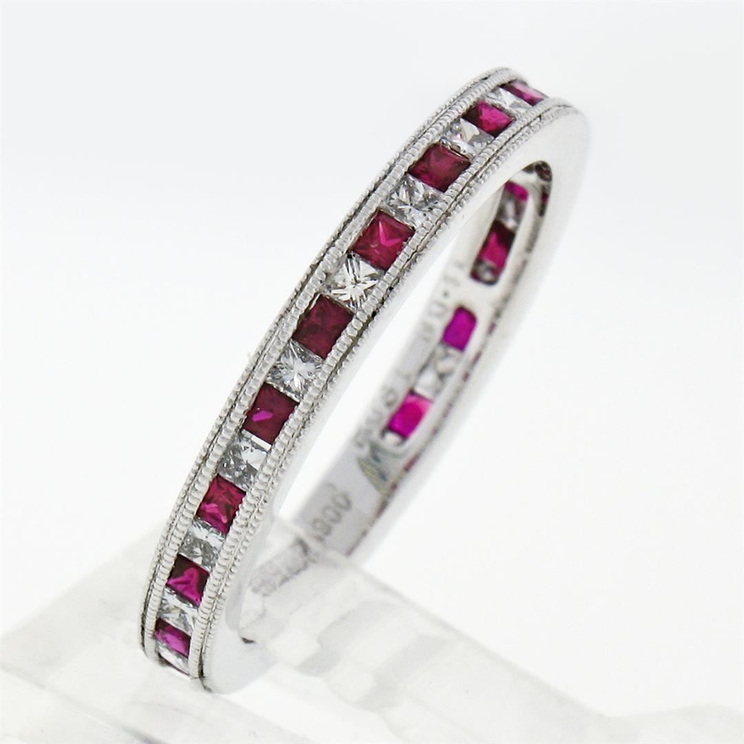 A new solid platinum eternity band ring, with 20 square calibre cut natural rubies (0.51ctw), and 20 square custom cut natural diamonds (G/H- VS1/VS2; 0.41ctw). The ring is size 6.0, weighs a total of 3.43 grams, and measures 2.70mm wide.