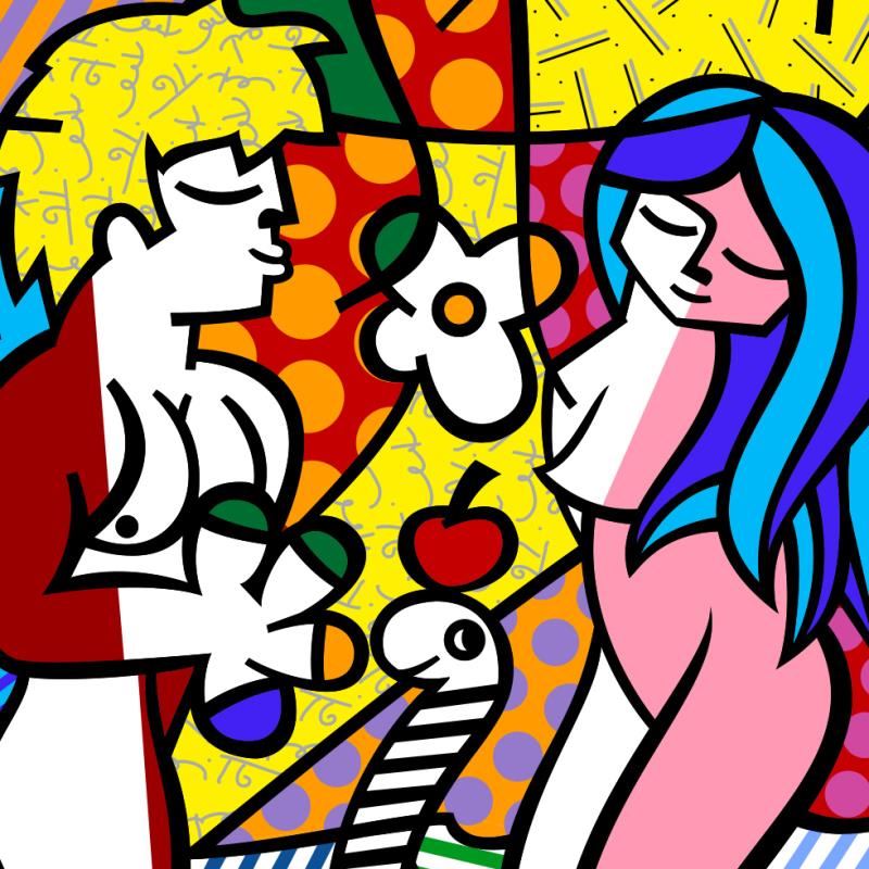 "New Adam & Eve" is an open edition giclee on canvas by Romero Britto. The piece comes hand signed by the artist and is authenticated en verso with the official Britto stamp. Measures approximately: 14" x 11".