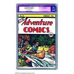 New Adventure Comics #24 Cosmic Aeroplane pedigree (DC, 1938) CGC Apparent VF 8.0 Slight (A) Cream to off-white pages. Creig Flessel's covers for this title and the subsequent Adventure Comics are prized as some of the most distinctive of the years immediately preceding and just after the dawn of the Golden Age of comics. In terms of eye-appeal, this is one of his very best, demonstrating a remarkable use of the artist's entire palette. "Apparent VF" is a conservative description of how this copy presents. As for the slight restoration, CGC notes that "Restoration includes spine split sealed to cover." Preceding Action Comics #1 by four months, and rated "scarce" on the Gerber index, this gem is undervalued. Overstreet 2002 VF 8.0 value = $1,518. Important notice: We expect to be auctioning lots at the rate of 200-250 per hour. Sometimes eBay Premier live bid software cannot keep up with that pace, so we strongly recommend that you place a realistic proxy bid now as insurance to avoid disappointment. Also please note that all Heritage/CAA lots purchased through eBay Premier carry a 20% Buyer's Premium. Please make sure you read the Terms and Conditions.