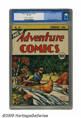 <B>New Adventure Comics #24 (DC, 1938) CGC VF 8.0 Light tan to off-white pages.</B></I> The gorgeous cover is by Creig Flessel. Joe Shuster contributed interior art. Easily the nicest copy CGC has certified to date of #24, the book rates a Gerber "scarce". Overstreet 2005 VF 8.0 value = $1,469. CGC census 1/05: 1 in 8.0, none higher. <I>From the Northern Lights Collection</B></I>.