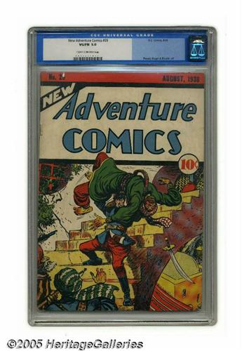 <B>New Adventure Comics #29 (DC, 1938) CGC VG/FN 5.0 Cream to off-white pages.</B></I> Before 1940 cover artist Creig Flessel was comic's pre-eminent front man. He's backed in this issue by Fred Guardineer, Joe Shuster, and Bob Kane. CGC has certified just two copies of this Gerber "scarce" book to date. Overstreet 2005 VG 4.0 value = $534; FN 6.0 value = $800. CGC census 1/05: 1 in 5.0, 1 higher. <I>From the Northern Lights Collection</B></I>.