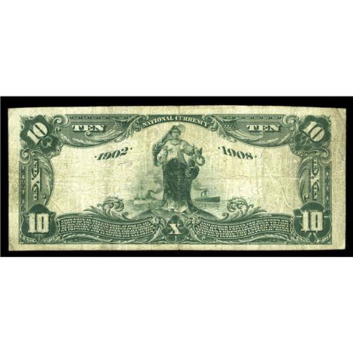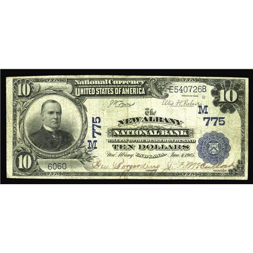 <B>New Albany, IN</B></I> - $10 1902 Date Back Fr. 616 <B>The New Albany NB</B></I> Ch. # (M)775<BR>This fully original note has solid margins all around and nothing but even circulation to speak of. The stamped signatures have survived the test of time. Of the eleven large size notes listed in the census only two are Series 1902 Date Backs. <B>Fine.</B></I>