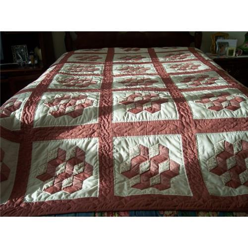 I went to an auction over the past week-end where the Amish in our area were selling items to raise money for their school.I purchased a number of the quilts,so will be listing them for sale except for a few I had to keep.These are BEAUTIFUL quilts,and if you have ever had the opportunity to own an Amish quilt you will understand what I mean.The work on these quilts are done by hand and are an art unto itself.I am pricing them all very reasonable so everyone has the opportunity to own one.Many of these quilts are from the Wisconsin Amish and some were sent here from the Pennsylvania Amish.I will list in the description the size,where they came from and who made them.This is one of my favority patterns,the Appliqued Tumbling block.It measures 85 x 111" and was made by Mrs. John Hershberger from Westby,Wisconsin.Wonderful quilt.
