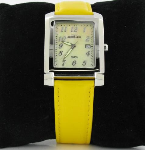 New tank style watch in excellent condition with yellow mother-of-pearl face and matching leather band; box and papers; retail $1995
