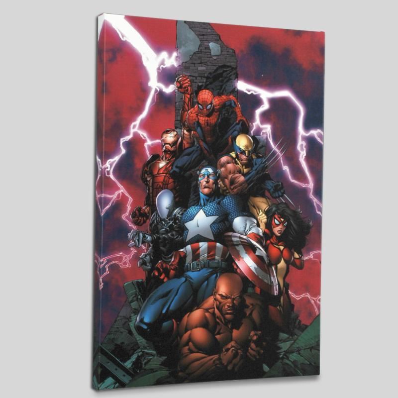 A piece of comic book history, this limited edition, from original art by David Finch, depicts Spider-Man, Wolverine, Luke Cage, Spider Woman, Ronin, Captain America and Iron Man. In 2003, Finch came to Marvel Comics for a year-long arc on Ultimate X-Men, after which he began work on The Avengers and thereafter The New Avengers. He has also worked on such titles as Captain America, Spider-Man and the Hulk. "New Avengers #1" is a limited edition numbered giclee on canvas by David Finch presented by Marvel Comics. This piece comes gallery wrapped. Includes Certificate of Authenticity! Measure approx. 18" x 27" (image).