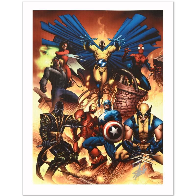 A piece of comic book history, this limited edition, from original art by Joe Quesada, depicts the heroic Avengers. Joe Quesada gained renown in the comic book by drawing several Valiant Comics titles. In 1998, Quesada started a series for Marvel called Marvel Knights, the success of which launched him into the editor-in-chief seat and then Chief Creative Officer in 2010. "New Avengers #1" is an extremely limited numbered giclee on canvas by Joe Quesada presented by Marvel Comics, numbered and hand signed by the Great Stan Lee (1922-2018)! Includes Certificate of Authenticity! Measures approx. 18" x 24" (image).