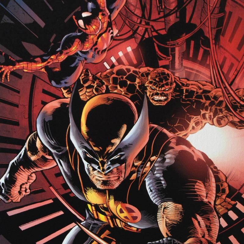 A piece of comic book history, this limited edition, from original art by Mike Deodato Jr., depicts an intense Wolverine, Spider-Man and Thing. Brazilian artist Mike Deodato Jr. has become an enduring fan favorite, working in styles ranging from wildly energetic cartooning to moody photorealism. Deodato became one of the decade's most prolific and in-demand artists, including Marvel credits such as Avengers, Elektra, Incredible Hulk, Spider-Man and Thor. "New Avengers #11" is a limited edition numbered giclee on stretched canvas by Mike Deodato Jr. presented by Marvel Comics. This piece comes gallery wrapped. Includes Certificate of Authenticity! Measure approx. 18" x 27" (image); 1.5" (depth).