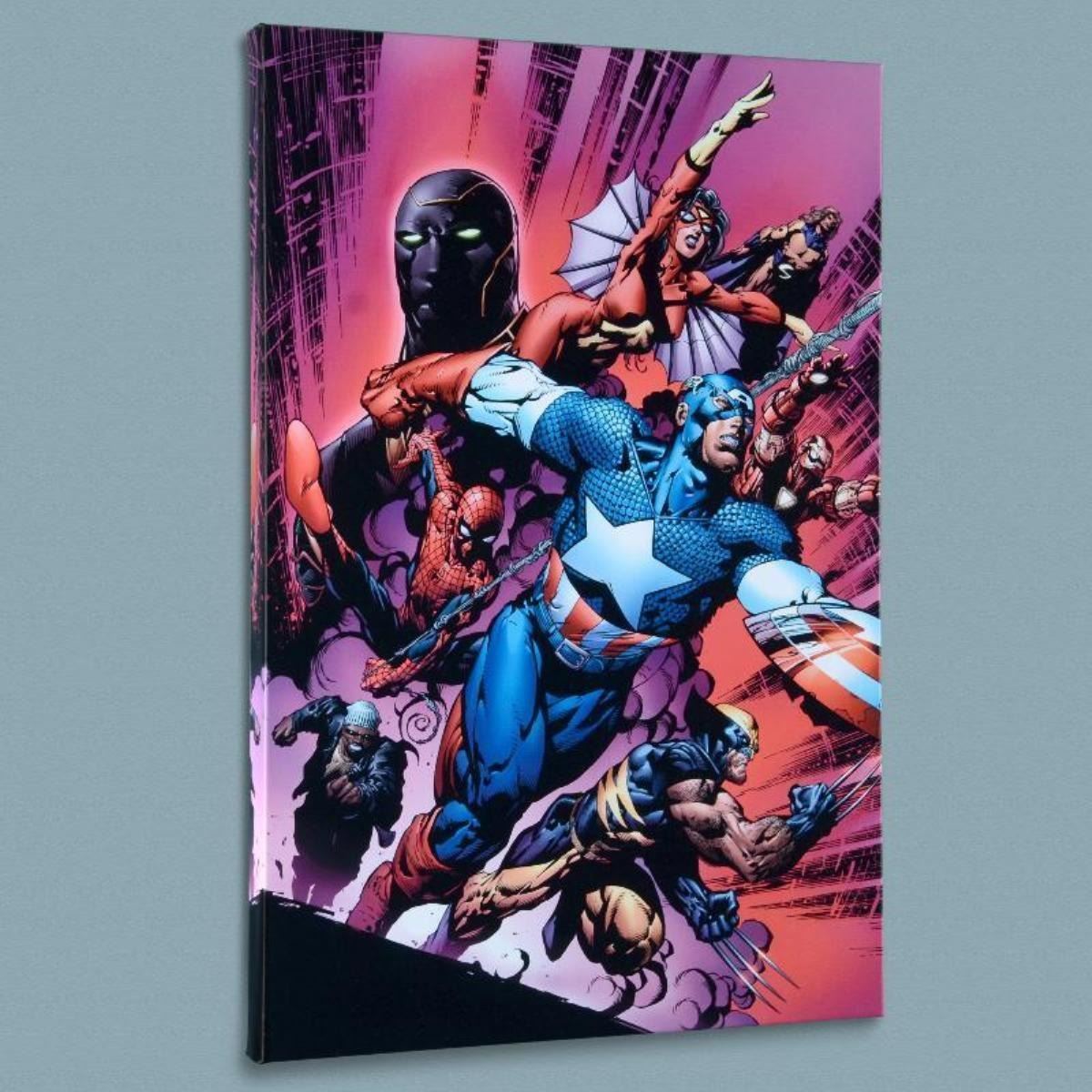 A piece of comic book history, this limited edition, from original art by Mike Deodato Jr., depicts Red Skull, Captain America and Nick Fury. Brazilian artist Mike Deodato Jr. has become an enduring fan favorite, working in styles ranging from wildly energetic cartooning to moody photorealism. Deodato became one of the decade's most prolific and in-demand artists, including Marvel credits such as Avengers, Elektra, Incredible Hulk, Spider-Man and Thor. "New Avengers #12" is a limited edition numbered giclee on canvas by Mike Deodato Jr. presented by Marvel Comics. This piece comes gallery wrapped. Includes Certificate of Authenticity! Measures approx. 18" x 27" (image).