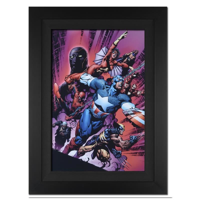 A piece of comic book history, this limited edition, from original art by David Finch, depicts Captain America and other characters from the Marvel Universe. In 2003, Finch came to Marvel Comics for a year-long arc on Ultimate X-Men, after which he began work on The Avengers and thereafter The New Avengers. He has also worked on such titles as Captain America, Spider-Man and the Hulk. "New Avengers #12" is an extremely limited edition giclee on canvas by David Finch presented by Marvel Comics, hand signed by the great Stan Lee and numbered out of only 4! This piece comes custom framed and ready to hang. Includes Certificate of Authenticity! Measures approx. 29" x 40" (with frame); 22" x 33" (image).