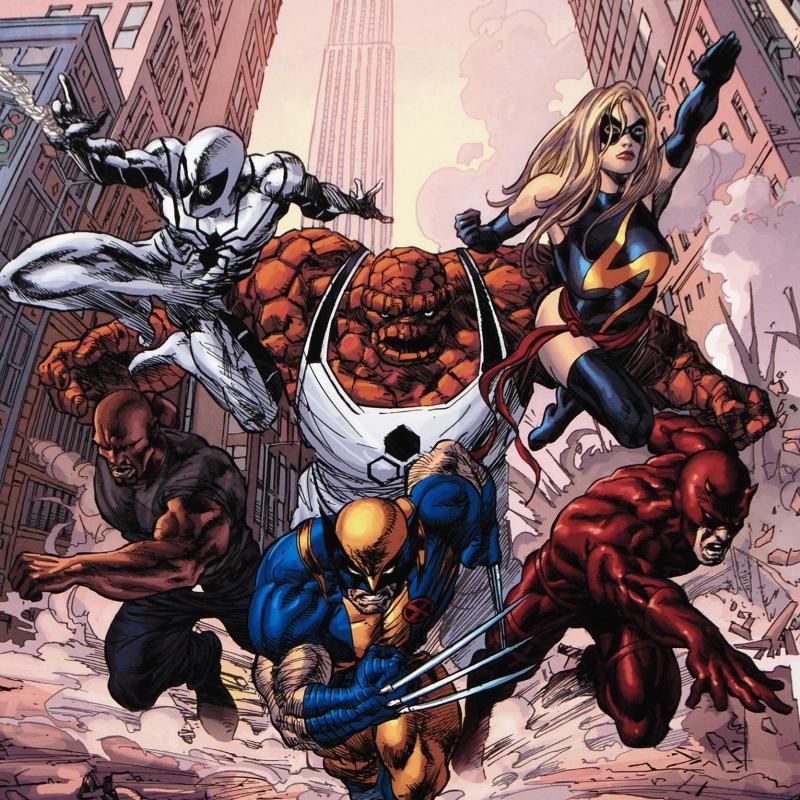 A piece of comic book history, this limited edition print, drawn by Mike Deodato Jr., depicts Wolverine, Daredevil, Thing, Luke Cage, Ms. Marvel, and Spider Man. Brazilian artist Mike Deodato Jr. has become an enduring fan favorite, working in styles ranging from wildly energetic cartooning to moody photorealism. Deodato became one of the decade's most prolific and in-demand artists, including Marvel credits such as Avengers, Elektra, Incredible Hulk, Spider-Man and Thor. "New Avengers #17" is a limited edition numbered giclee on canvas by Mike Deodato Jr. presented by Marvel Comics. This piece ocmes gallery wrapped and ready to hang. Includes Certificate of Authenticity! Measure approx. 18" x 27" (image).
