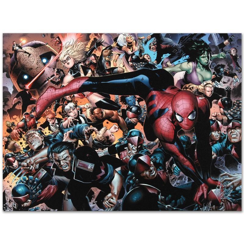 A piece of comic book history, this limited edition, from original art by Jim Cheung, depicts a plethora of classic characters from the Marvel Universe. Jim Cheung was named as one of 2005's "Young Guns" by Marvel Editor-in-Chief Joe Quesada, and has been described as a "future superstar penciller." "New Avengers #45" is a limited edition numbered giclee on stretched canvas by Jim Cheung presented by Marvel Comics. This piece comes gallery wrapped. Includes Certificate of Authenticity! Measures approx. 24" x 18" (image); 1.5" (depth).