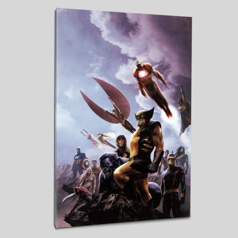 A piece of comic book history, this limited edition, from original art by Aleksi Briclot, depicts an action packed scene featuring the Avengers. Aleksi Briclot is known for his hauntingly dark style, which he has now brought to the Avenger's franchise. "New Avengers #45" is a limited edition numbered giclee on stretched canvas by Aleksi Briclot presented by Marvel Comics. This piece comes gallery wrapped. Includes Certificate of Authenticity! Measures approx. 18" x 27" (image); 1.5" (depth).