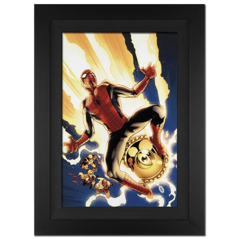 A piece of comic book history, this limited edition, from original art by Stuart Immonen, depicts the classic character Spider-Man fighting along side other Marvel heroes. Stuart Immonen is a Canadian comic book artist. He is best known for his work on Nextwave, Ultimate X-Men, The New Avengers and Ultimate Spider-Man. Immonen studied at Toronto's York University, pursuing a career in art. In 1988, he self-published a series called Playground; it was his first published work. He worked at several smaller comic book companies before being hired by DC Comics and Marvel Comics in 1993. "New Avengers #4" is an extremely limited edition giclee on canvas by Stuart Immonen presented by Marvel Comics, hand signed by the great Stan Lee and numbered out of only 10! This piece comes custom framed and ready to hang. Includes Certificate of Authenticity! Measures approx. 25" x 34" (with frame), 18" x 27" (image).