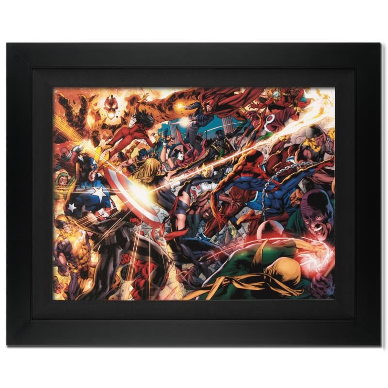 A piece of comic book history, this limited edition, from original art by Billy Tan, depicts a miltitude of super heroes in this action packed scene. Billy Tan grew up in Malaysia and moved to the United States in 1989 to study business at the University of Kentucky. He began working as a penciler for Image Comics in the 1990s. Tan became the regular artist of the Marvel Comics series Uncanny X-Men in 2006. In 2008, he was invited to draw New Avengers Secret Invasion tie-in issues #41 and 43-44. "New Avengers #50" is an extremely limited edition giclee on canvas by Billy Tan presented by Marvel Comics, hand signed by the Great Stan Lee (1922-2018) and numbered out of only 10! This piece is custom framed and ready to hang. Includes Certificate of Authenticity! Measures approx. 31" x 25" (with frame), 24" x 18" (image).