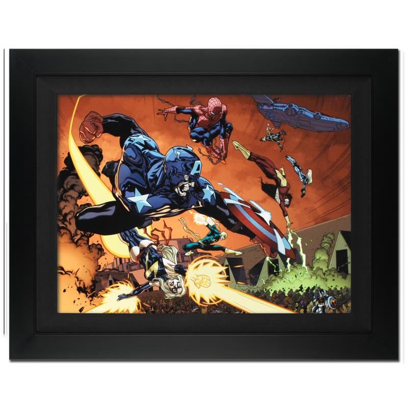 A piece of comic book history, this limited edition, from original art by Stuart Immonen, depicts the classic characters Captain America, Spider-Man. Ms. Marvel, Spider Woman and Iron Fist. Stuart Immonen is a Canadian comic book artist. He is best known for his work on Nextwave, Ultimate X-Men, The New Avengers and Ultimate Spider-Man. Immonen studied at Toronto's York University, pursuing a career in art. In 1988, he self-published a series called Playground; it was his first published work. He worked at several smaller comic book companies before being hired by DC Comics and Marvel Comics in 1993. "New Avengers #59" is an extremely limited edition giclee on canvas by Stuart Immonen presented by Marvel Comics, hand signed by the great Stan Lee and numbered out of only 10! This piece comes custom framed and ready to hang. Includes Certificate of Authenticity! Measures approx. 31" x 25" (with frame); 24" x 18" (image).
