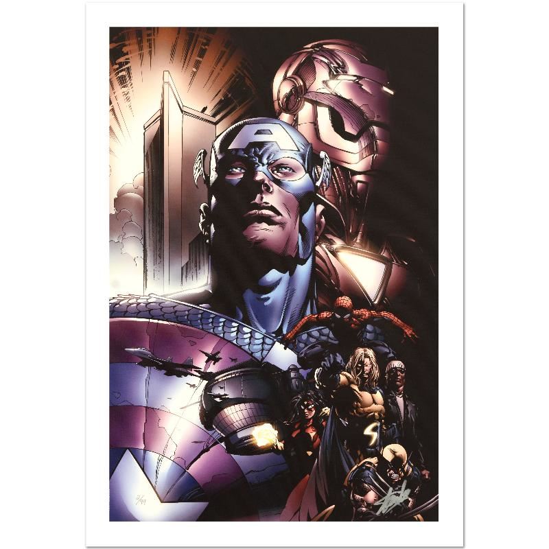 A piece of comic book history, this limited edition, from original art by David Finch, Captain America, Iron Man, Spider-Man, Spider Woman, Sentry, Luke Cage and Wolverine. In 2003, Finch came to Marvel Comics for a year-long arc on Ultimate X-Men, after which he began work on The Avengers and thereafter The New Avengers. He has also worked on such titles as Captain America, Spider-Man and the Hulk. "New Avengers #6" is a limited edition giclee on canvas by David Finch presented by Marvel Comics, numbered and hand signed by the Great Stan Lee (1922-2018)! Includes Certificate of Authenticity! Measures approx. 18" x 27" (image).