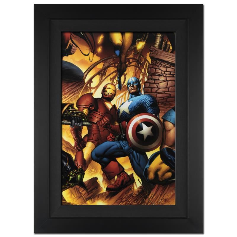 A piece of comic book history, this limited edition, from original art by Bryan Hitch, depicts the classic Captain America and Iron Man. British artist Bryan Hitch was inspired by comic books at an early age. Not only has Hitch worked on the The Avengers, Captain America, and She-Hulk, he also did the character design for the Ultimate Avengers and Ultimate Avengers 2 animated films. "New Avengers #6" is an extremely limited edition giclee on canvas by Bryan Hitch presented by Marvel Comics, hand signed by the Great Stan Lee (1922-2018) and numbered out of only 10! This piece comes custom framed and ready to hang. Includes Certificate of Authenticity! Measures approx. 25" x 34" (with frame); 18" x 27" (image).