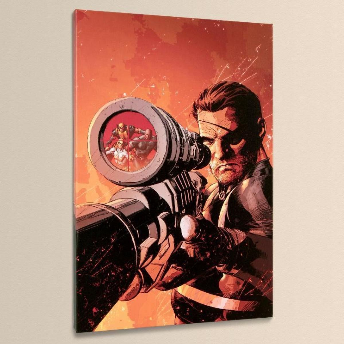 A piece of comic book history, this limited edition, from original art by Mike Deodato Jr., depicts an intense Nick Fury. Brazilian artist Mike Deodato Jr. has become an enduring fan favorite, working in styles ranging from wildly energetic cartooning to moody photorealism. Deodato became one of the decade's most prolific and in-demand artists, including Marvel credits such as Avengers, Elektra, Incredible Hulk, Spider-Man and Thor. "New Avengers #9" is a limited edition numbered giclee on stretched canvas by Mike Deodato Jr. presented by Marvel Comics. This piece comes gallery wrapped. Includes Certificate of Authenticity! Measures approx. 18" x 27" (image); 1.5" (depth).
