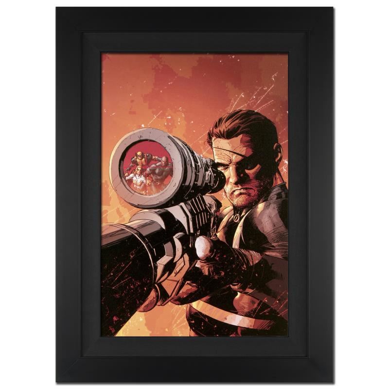A piece of comic book history, this limited edition, from original art by Mike Deodato Jr., depicts an intense Nick Fury. Brazilian artist Mike Deodato Jr. has become an enduring fan favorite, working in styles ranging from wildly energetic cartooning to moody photorealism. Deodato became one of the decade's most prolific and in-demand artists, including Marvel credits such as Avengers, Elektra, Incredible Hulk, Spider-Man and Thor. "New Avengers #9" is an extremely limited edition giclee on canvas by Mike Deodato Jr. presented by Marvel Comics, hand signed by the great Stan Lee and numbered out of only 4! Includes Certificate of Authenticity! This piece comes custom framed and ready to hang. Includes Certificate of Authenticity! Measures approx. 29" x 40" (with frame); 22" x 33" (image).